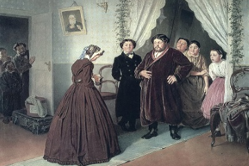 Однако как только тонкий узнает, что толстый дослужился до высокого чина тайного советника, он тут же меняет манеру разговора. С фамильярного «ты» коллежский асессор переходит на «вы», добавляя почтенное «превосходительство». Принимается лепетать что-то приторно-заискивающее, сбивается, запинается и повторно представляет толстому вытянувшееся в струнку семейство.